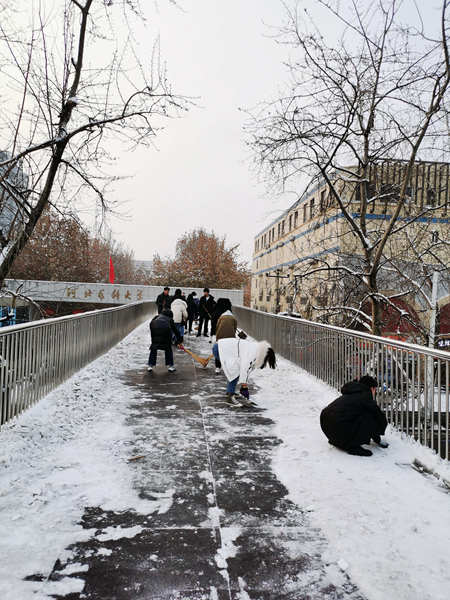 1月7日,学生第二党支部第三党小组开展了“清积雪,助通行”志愿服务活动。在辅导员靳明志带领下,第三党小组所有党员和积极分子全部集中到连接南北院通行的天桥上开展志愿服务活动。